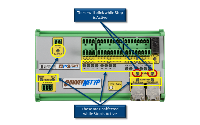 Any powered CNIP modules within a Stop Group that has an active Stop Command will flash their Module and Network Status LEDs in Red. All other LEDs will remain unaffected.