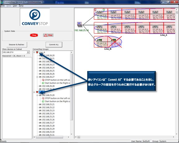 ConveyStop をソフトウェア内で設定しただけなので、手順はまだ完了していません。この機能をConveyLinxで適用する必要があります。 “Commit All”ボタンをクリックすると、現在の 停止グループ 、ボタン等の構成が実際のデバイスに送信されます。完了すると ConveyStop 、ボタン等の構成が実際のデバイスに送信されます。完了すると ConveyStop 画面に接続されたデバイスのステータスが表示されます。