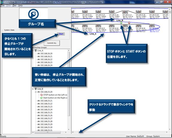 以下の図は、今回の例で両方の 停止グループ が動作可能で、停止条件がアクティブではなく、開始待ちの停止グループが無い場合の表示画面です。