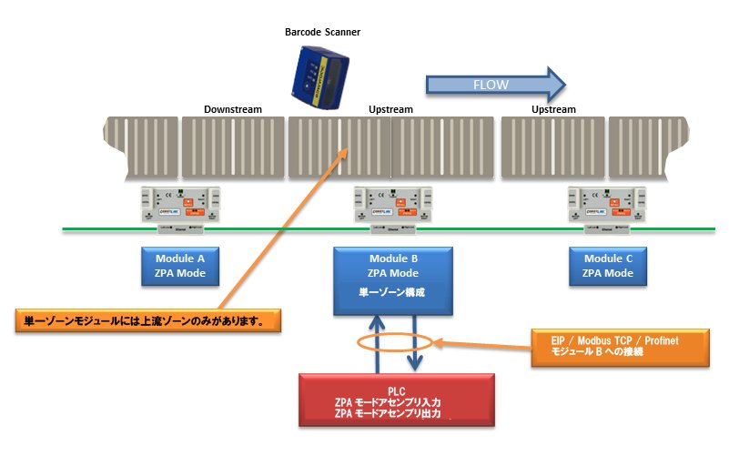 ZPA機能が組み込まれているため、搬送物が モジュールA の搬出ゾーンを離れると、 モジュールA は モジュールB から搬送物到着の確認を受け取るまで待機します。新しい搬送物が モジュールA に到着すると、この到着確認が行われるまで集積されます。 モジュールB は単一の長いゾーンであるため、 モジュールB の上流ゾーン(2ゾーンとして構成されている場合)であった場所は、搬送物が モジュールB に集積される時は基本的に空いたままになります。これはバーコードスキャナーがあるエリアです。この構成では、 モジュールB への新しい到着はバーコードリーダーからの最後のスキャンに関連付けられた搬送物であることが確実になります。この例では、PLCはモジュールBとの接続を確立してから、 基本的な集積と搬送 の説明に従いゾーン制御を行う必要があります。