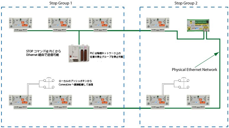 ConveyLinxがコンベアの動きに基づいて論理的接続を確立するのと同様に、 ConveyStop を適用すると、モジュール間の 停止グループ 接続が確立され、ストップとスタートのネットワークコマンドによって影響を受けるのは、指定された 停止グループ 内のモジュールだけになります。ConveyStopを使用すると、 停止グループ 内の全てのモジュールがイーサネットで物理的に接続されている限り、任意のシステムをいくつでも必要な数の 停止グループ に分離することができます。