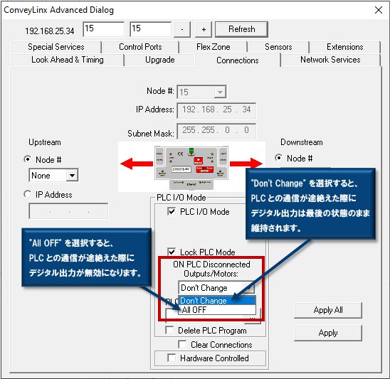 モジュールのデジタル出力が 停止コマンド にどのように応答するかは、モジュールのモードと EasyRoll の設定に依存します。モジュールをAdvanced DialogのConnectionsタブからPLC I/Oモードにする時、PLCとの通信が失われた時にどのように応答するかを選択する、ユーザー向けドロップダウンボックスがあります。選択肢は、出力をオフにするか、最後の状態のままにするかです。この設定は 停止コマンド 中の出力の応答方法にも影響します。