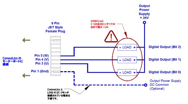 外部コントローラーは、デジタル出力として使用するモーターポート(左または右)の Set Left/Right Motor Port Digital Control レジスタのビット15=1を最初に設定しないといけません。ビット15=0の場合、ConveyLinxはビット0~ビット2コマンドを無視し、対応している該当ポートの Left/Right Motor Port Digital I/O Status レジスタのビット12とビット14に意味のあるステータスを与えません。 ビット0、ビット1、ビット2はPLCによって個別に設定とリセットが可能であり、3つのデジタル出力全てに同時に通電できます。