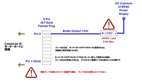 ConveyLinxがPLC I/Oモードの時、ブレーキ出力(JSTコネクター ピン9)をPLCプログラムから制御される+24V出力信号として利用することもできます。この信号のソース電圧は+24Vで、負荷は0.5Aに制限されています。