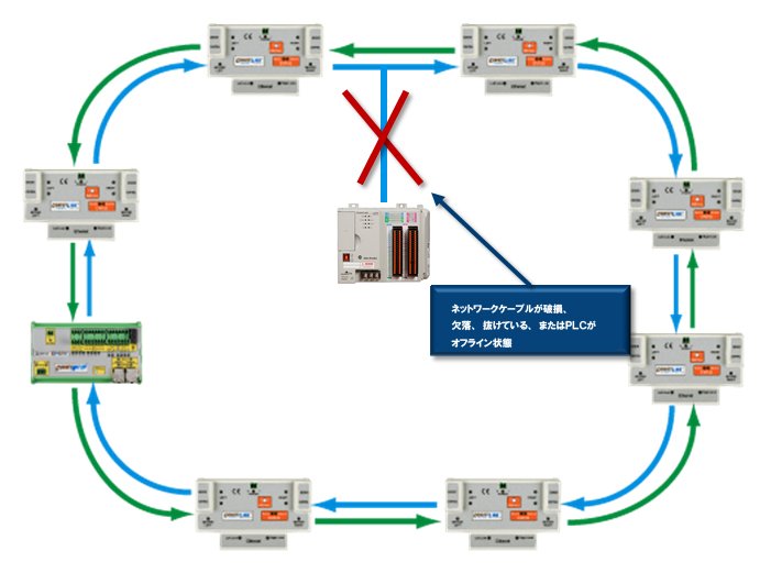 単一のデバイス (ConveyLinx または ConveyNet I/P) が、例えばプラグ抜けやケーブル損傷などの理由で構成された 停止グループ から欠落した場合、 停止グループ 内の全てのモジュールに 停止コマンド が発行されます。