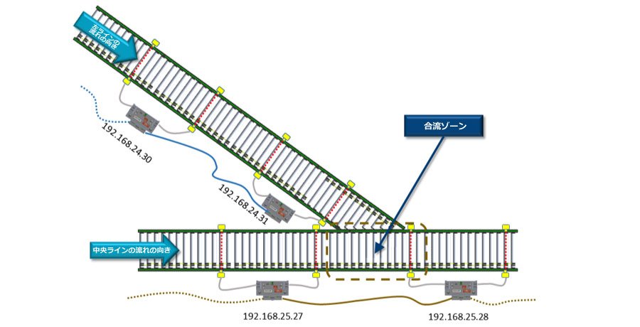 合流ゾーン はモジュールの上流ゾーン192.168.25.28で、 * 左ライン* の最下流 ConveyLinx は192.168.24.31です。これらの値を入力した ConveyMerge 設定画面 は以下の通りです。