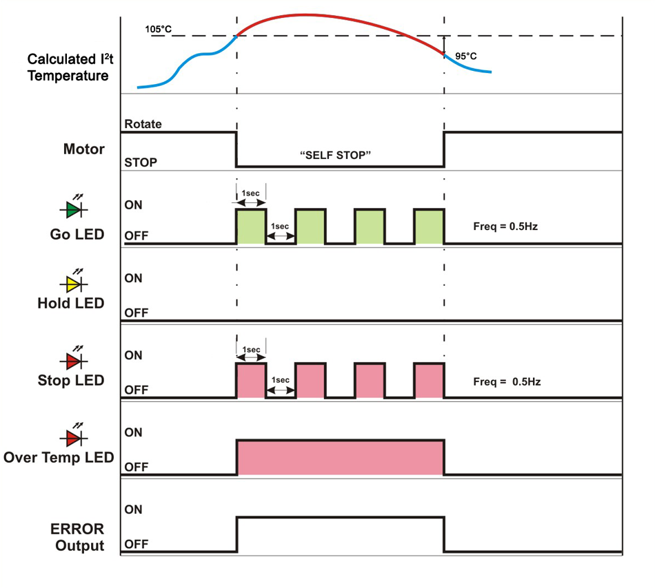 When the calculated motor temperature reaches 105°C, the motor enters a Self Stop Period. This period lasts until the calculated temperature reaches 95°C and maintains this for 5 seconds after which the motor will restart.