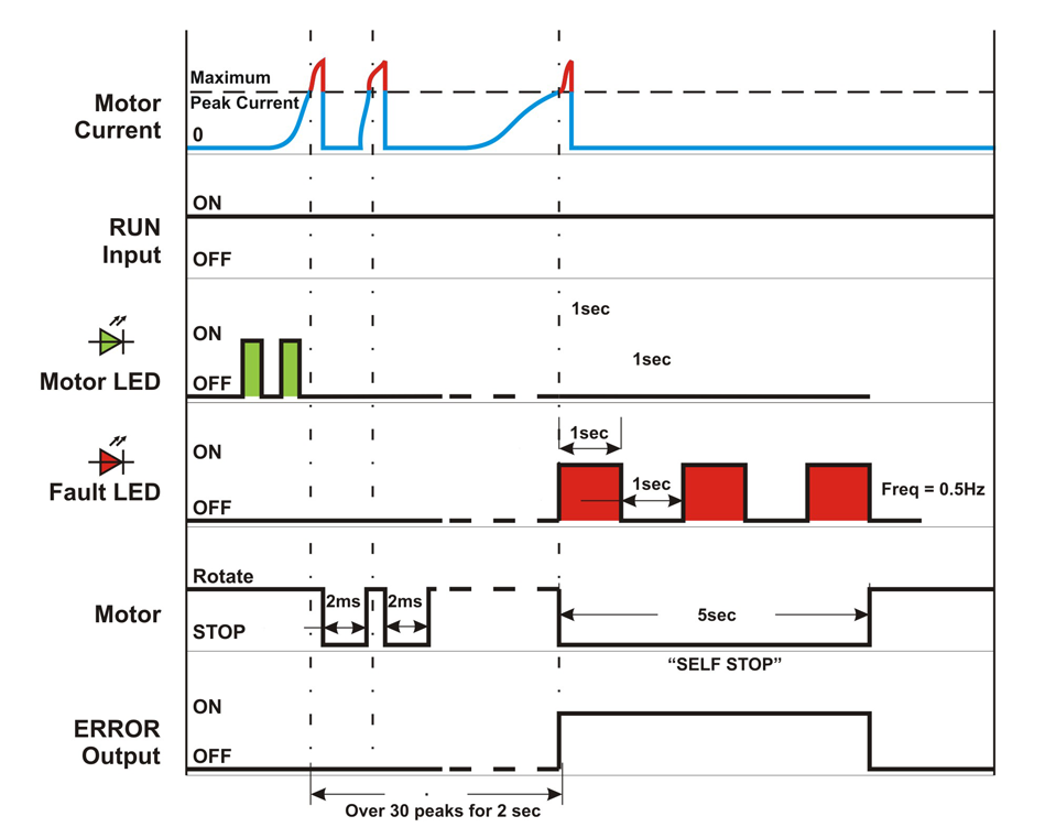 *Diagram depicts operation when CONFIG DIP SW 4 is set to ON (Automatic Reset) which causes the motor to automatically restart after forced stop. If CONFIG DIP SW 4 is set to OFF (Manual Reset), then the RUN signal must be toggled OFF then ON again to restart the motor.
