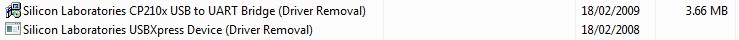 An an added check on whether or not the relevant driver has been installed, you can look in Windows Control Panel in the Add/Remove software section (or the corresponding place in different Windows versions, eg ‘Programs and Features’ in Vista). The image below shows a PC where both drivers are present. (Silicon Laboratories being the company that actually writes and supplies the drivers). Be careful just to look at these entries and not to click on them, which will start the process of uninstalling the drivers.