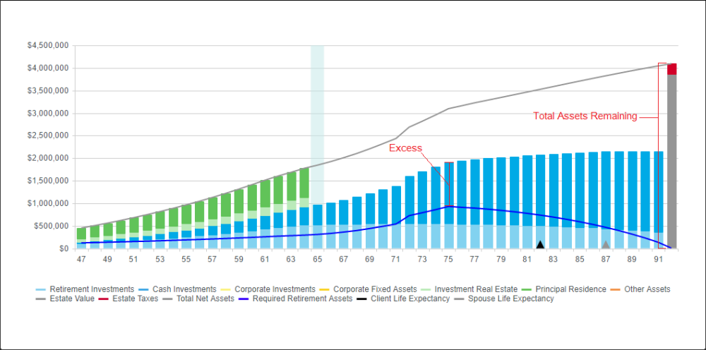 When a client has excess cash flow in retirement, you will see values over and above the client’s Retirement Income Needs. Typically, when a client has excess income in retirement the software will direct the excess towards the client’s investments automatically for use in future years. The software will deposit to the client’s Non-Registered Investments. If you have a client with an unrealistically low lifestyle goal in relation to their fixed income and assets, you may encounter very large excesses which will in turn create large assets at life expectancy.