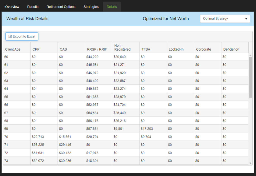 - Locked-In – The combined withdrawal from the client and spouse/partner (if entered) Locked-In accounts for the selected strategy.