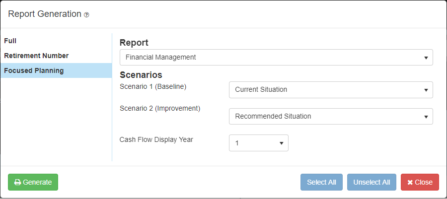 To build the Financial Management report, in the Report Generation window select Focused Planning, then choose Financial Management from the Report drop-down. Under Scenarios choose the two scenarios that are going to be compared to each other. The cash flow statement page in this report can display any 10 years of detailed cash flow. Use the Cash Flow Display Year drop-down to select the year the Cash Flow Statement starts. Then click the