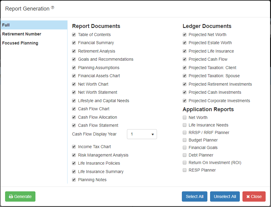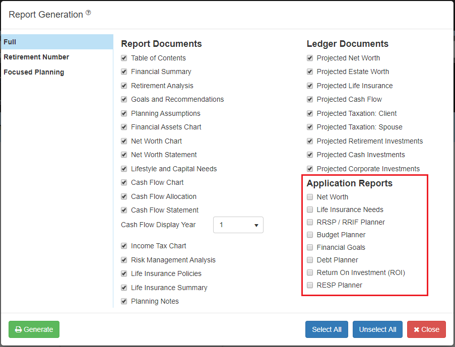The Full Report also includes the option to include Ledger Documents and pages from the Applications Reports.