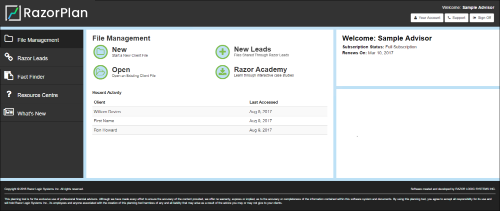 The Home Page displays account status and 4 additional areas; File Management, Fact Finder, Resource Centre and What’s New Home Page may also display the RazorLeads area depending on your settings in Your Account.