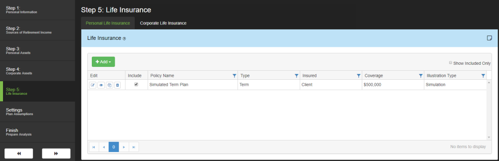 Life insurance assets of the clients are entered and displayed on the Life Insurance tab of Step 3. Add Insurance policies by clicking the