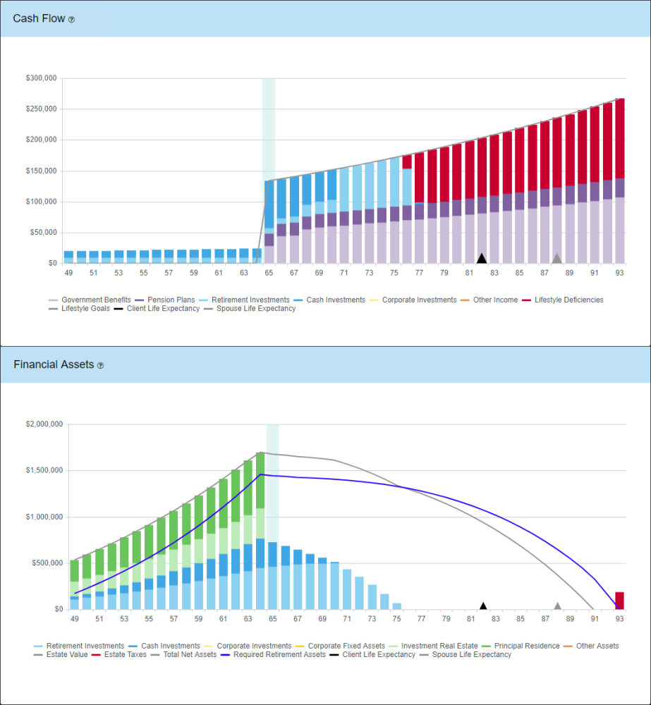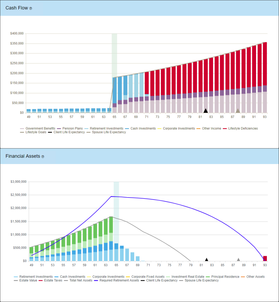 As we can see from the above Cash Flow Chart, Bill and Mary were unable to fund their lifestyle goals beyond age 84. At that time, the software began drawing money from the Lifestyle LOC to help fill the deficiencies. In the Financial Assets chart we can see that although they had large deficiencies, the value of the Lifestyle LOC at life expectancy has not entirely depleted the value of the grey Net Worth line. In fact, they still have substantial net worth remaining and a liquidation strategy may be the solution. The value of the recreational property (light green bars in Financial Assets Chart) more than fill the gap between liquid assets and the blue Required Retirement Assets line. By selling this property at retirement and investing the proceeds, the clients could eliminate all deficiencies in retirement.