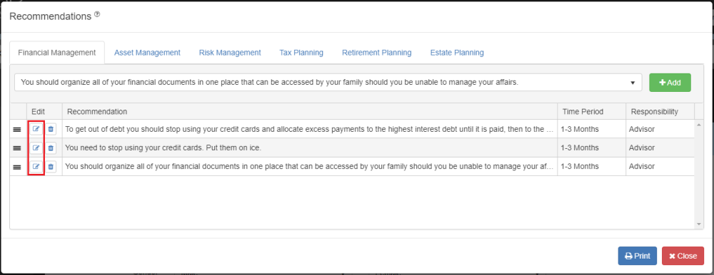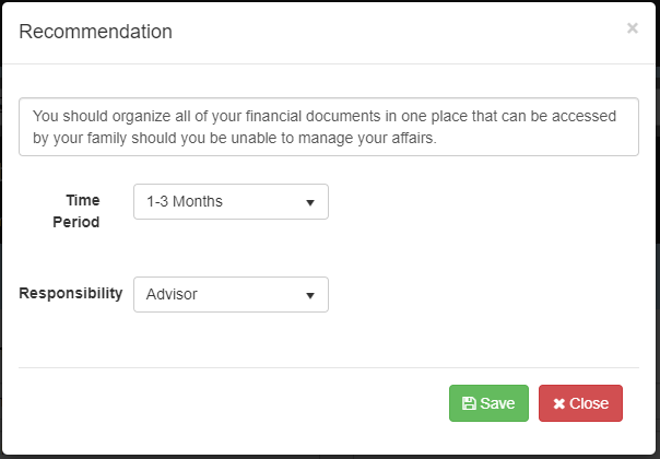 Responsibility: The individual responsible for managing the stated recommendation. This can be the Advisor, Client, Spouse/Partner or Other. When Other is selected an additional field for more details about the other person is displayed.