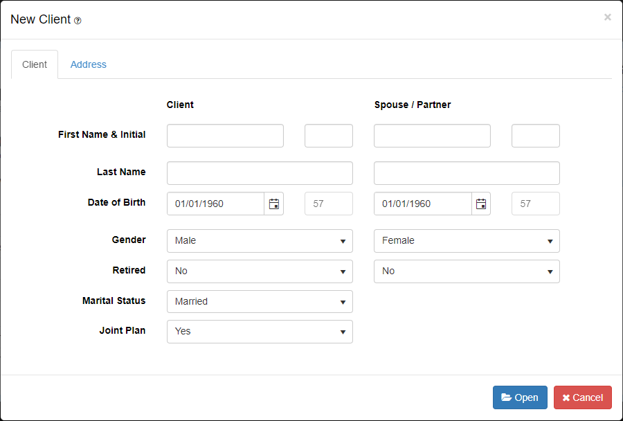 The Client tab allows you to enter your client’s information such as Name, Date of Birth, Gender and Marital and Retirement status. For more information on each data point, view the Client Information area of Data Entry.