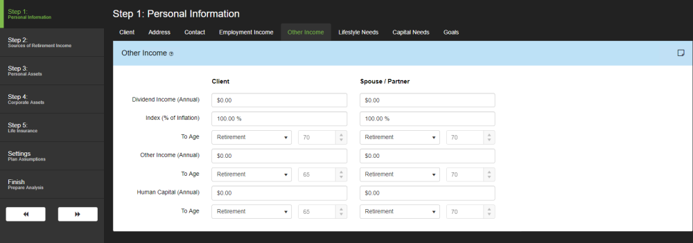 For each of the above areas enter the age at which the income will stop using the To Age selection. Select ‘Retirement’ from the drop-down to stop the income amount at the planned retirement age, or select ‘Age’ to establish a specific age for the amount to stop at.