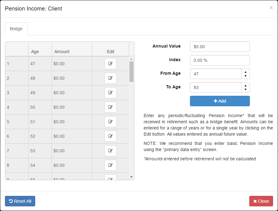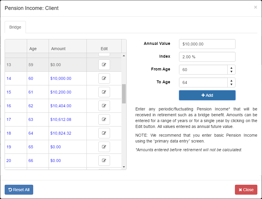 Start by entering the pension income and indexing to be applied. Pension income entered is considered to be annual future-value and will grow by the index assumption entered in this window.