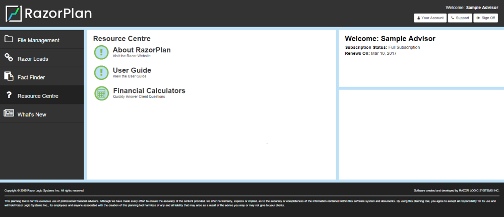 The Resource Centre contains useful resources and support documentation should you have any questions while using RazorPlan. From here you can access the User Guide, view Sample Reports and find out more information about RazorPlan.