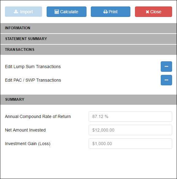 Start by entering any Lump Sum Transactions by entering any deposits and/or withdrawals made and the date processed. For PAC/SWP simply enter the monthly amount, the start date and the date of the last deposit/withdrawal. Finally enter the Statement Date and Value.