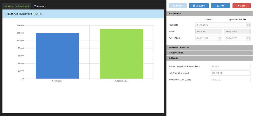 The Return on Investment (ROI) calculator, will calculate the Annual Compound Return for a client using the amounts and dates of any deposits and/or withdrawals.