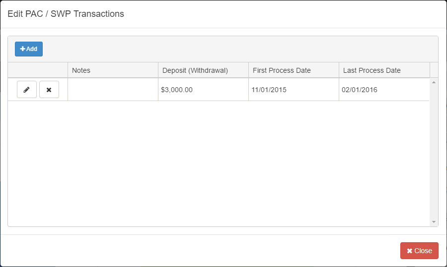 Enter all Lump Sum and PAC/SWP transactions. To enter a transaction click the appropriate
