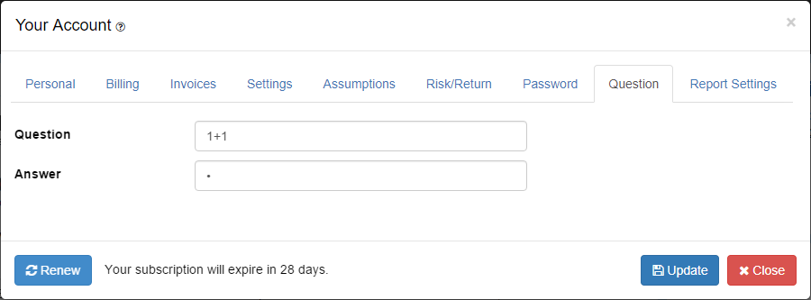 The Security Question tab in the Your Account window will allow you to change the security question required when resetting your password. When using the ‘forgot your password’ link from the login page, you will be required to enter your security answer.