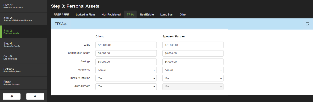 Contribution Room: Enter the available TFSA contribution room based on the client’s most recent tax year. TFSA savings will not be allowed beyond this amount.