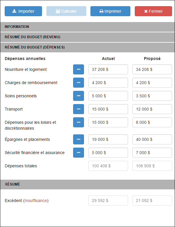 Commencez par la saisie de votre revenu et vos dépenses actuels dans la saisie de données de l’application. Une fois que vous avez saisi les numéros de budget actuel du client, vous pouvez apporter des modifications au budget proposé afin de réaffecter les revenus des catégories moins importantes aux plus importantes.