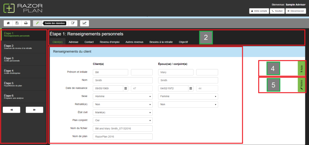 1 – Panneau de navigation: Il y a 6 étapes principales dans la saisie de données. Naviguez à travers chaque étape en la sélectionnant dans le panneau de navigation ou en sélectionnant les boutons