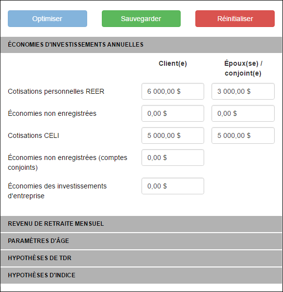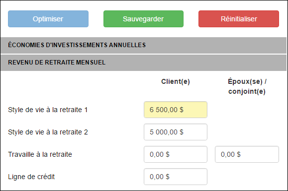 Le panneau de données vous permet de modifier des points clés de données du client tout en affichant simultanément les résultats. Vous pouvez modifier les données du client de deux façons; optimiser ou modifications manuelles.