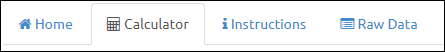 Each calculator has the same 4 tabs that can be used to navigate the tool. The Calculator Tab is where all data is entered and the results of all the calculations are displayed. The Instructions tab provides information about the calculator and instructions on how to use each calculator. The Raw Data tab will display additional calculations (if any) and data used by the calculator. Use the Home tab to return to the main screen where all calculators can be opened.