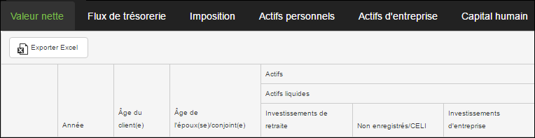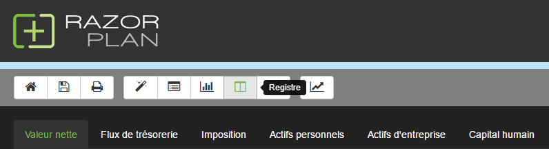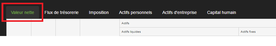 Il y a 6 registres disponibles; valeur nette, flux d’argent, imposition, actifs personnels, actifs d’entreprise et capital humain. Sélectionnez le registre que vous voulez afficher en cliquant l’onglet approprié en haut de l’écran.