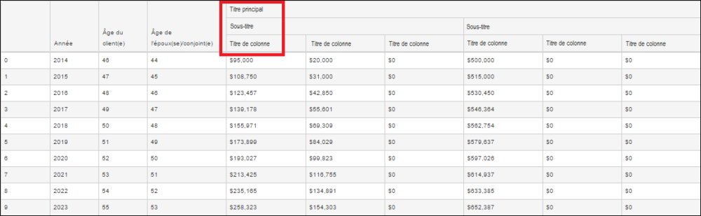 - Sous-titre – Le sous-titre correspond à l’ensemble de titres de colonnes.