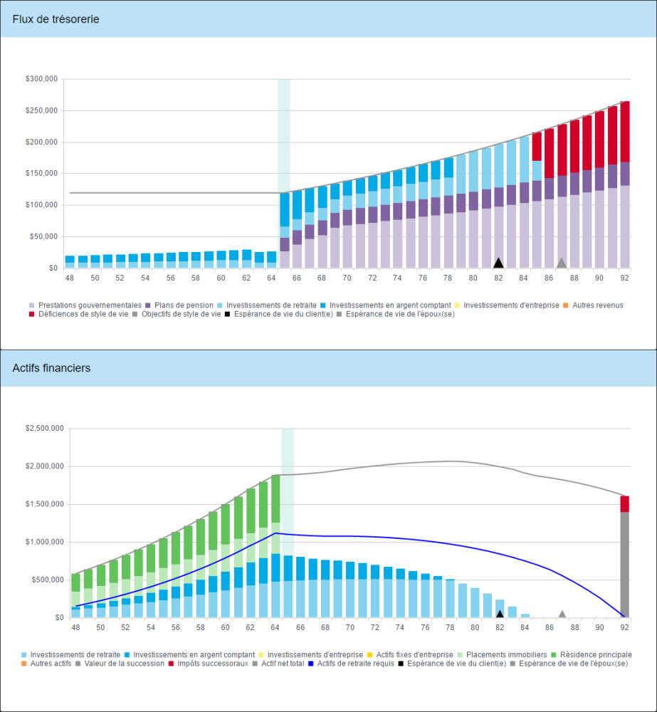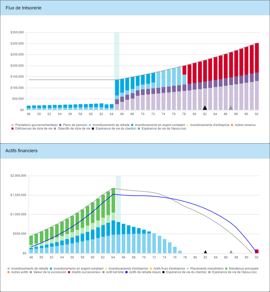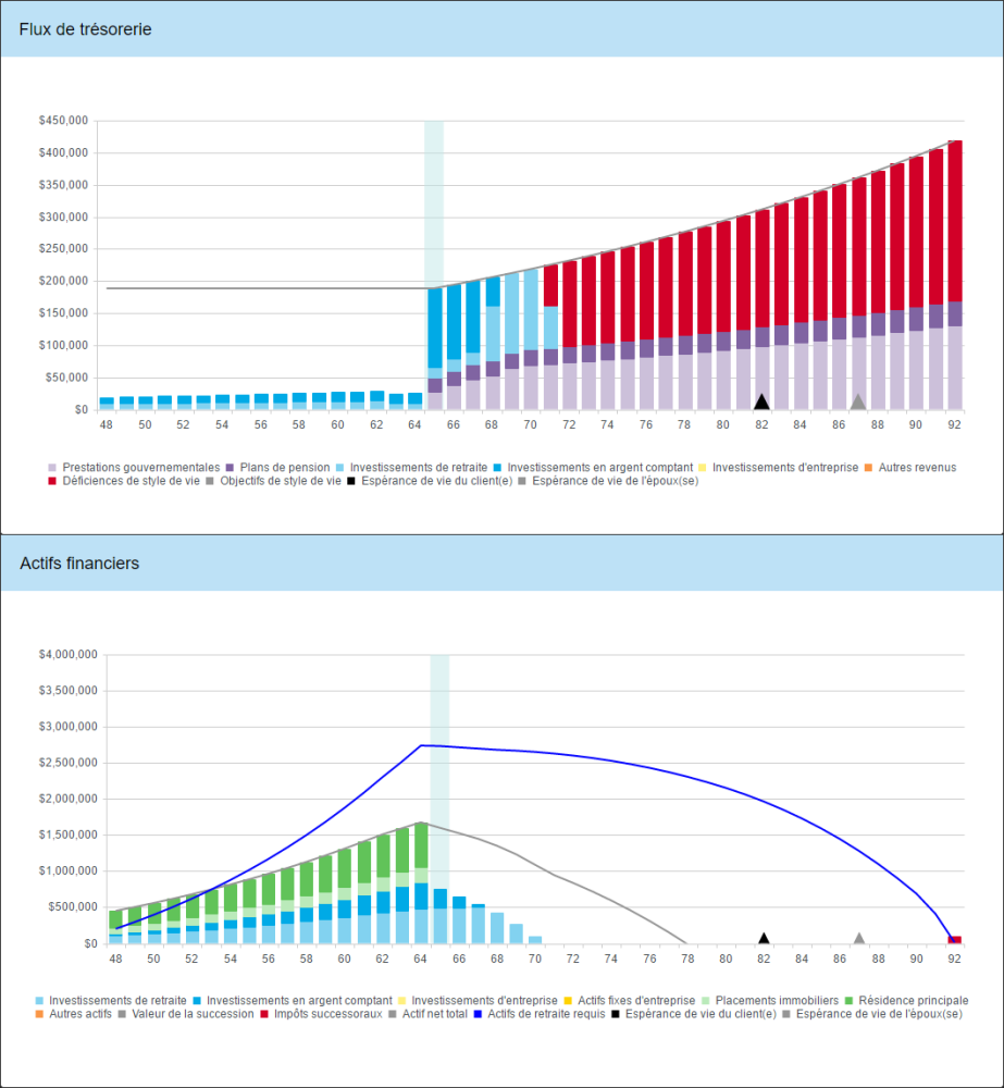 Comme nous pouvons voir dans le graphique de flux de trésorerie ci-dessus, Bill et Marie étaient incapables de financer leurs objectifs de style de vie au-dela de l’âge de 85 ans. À ce moment, le logiciel a commencé de retirer l’argent de la MC de style de vie pour aider à combler les carences. Dans le graphique d’actifs financiers, nous pouvons voir que, bien qu’ils avaient de grandes carences, la valeur de la MC de style de vie à l’espérance de vie n’a pas entièrement épuisé la valeur de ligne grise de la valeur nette. En fait, ils ont encore une valeur nette considérable qui reste, alors une stratégie de la liquidation peut être la solution. La valeur de la propriété de loisirs (les barres de couleur vert clair dans le graphique d’actifs financiers) facilement comblent l’écart entre les actifs liquides et la ligne bleue des actifs requis à la retraite. En vendant cette propriété à la retraite et investissant le produit, les clients pourraient éliminer toutes les carences à la retraite.