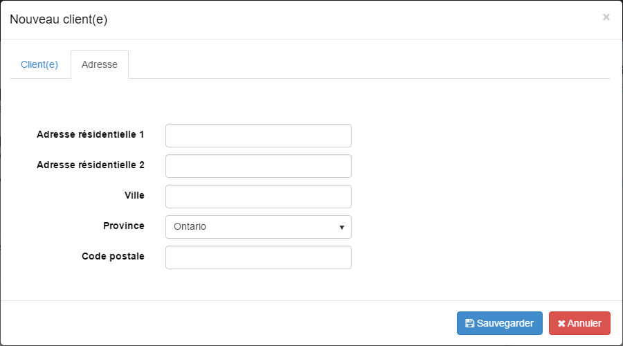 L’onglet d’adresse vous permet de saisir les informations d’adresse de votre client et leur province de résidence aux fins fiscales. Pour plus d’informations sur chaque point de données, verrez la zone d’adresse de la saisie de données.