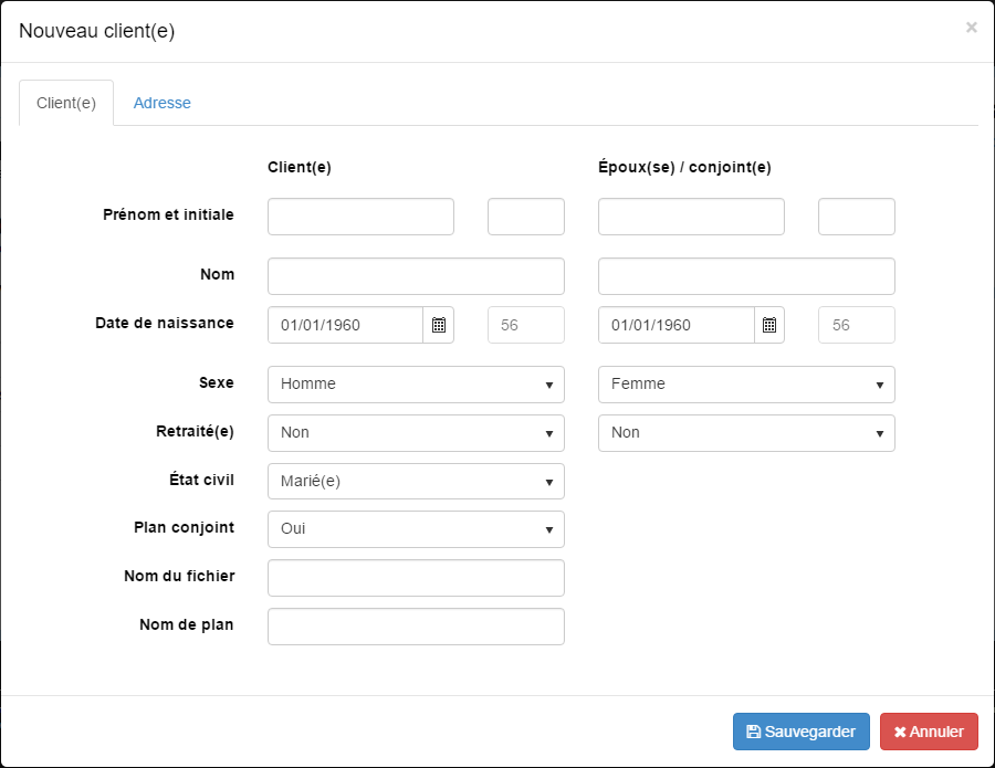 L’onglet de client vous permet de saisir les informations de votre client, telles que nom, date de naissance, sexe et le statut matrimonial et de la retraite. Pour plus d’informations sur chaque point de données, verrez la zone d’Informations de client de la saisie de données.