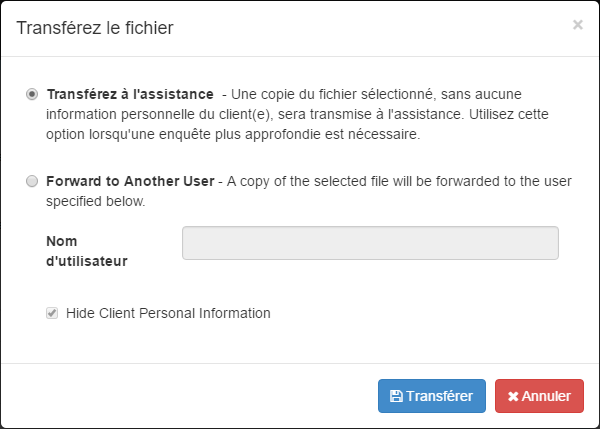 La fonction Transférer vous permet d’envoyer une copie du fichier de client à un autre utilisateur ou à l’assistance. Une fois qu’un fichier est sélectionné, cliquez le bouton
