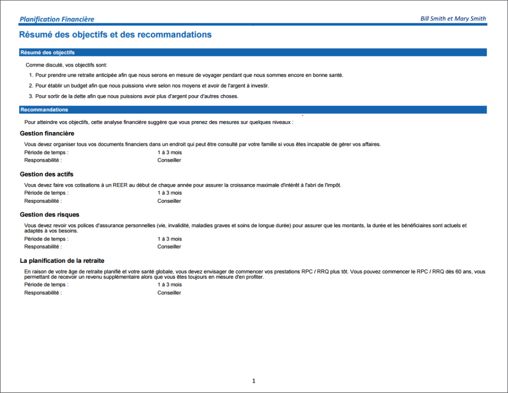 Une fois produit, le document de recommandations peut être enregistré, imprimé ou envoyé par courriel au client.