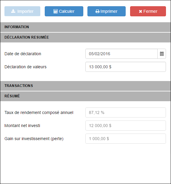- Résumé – Affiche un résumé de toutes les informations, y compris toutes les transactions et le taux de rendement annuel compose obtenu.