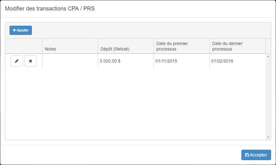 Entrez toutes les montants forfaitaires et les transactions PPA/PRS. Pour saisir une transaction cliquez sur le bouton