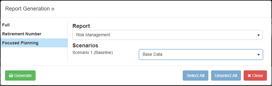 To build the Risk Management report, in the Report Generation window select Focused Planning, then choose Risk Management from the Report drop-down. Under Scenarios choose the scenario to use in the focused report and then click the