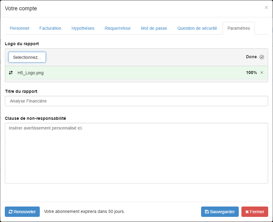 Ce champ vous permet de saisir une clause de non responsabilité personnalisée à vos rapports. Cette clause sera affichée à la fin de votre rapport. Si aucune clause personnalisée n’est entrée, les rapports afficheront la clause de défaut. Une fois saisie, cliquez