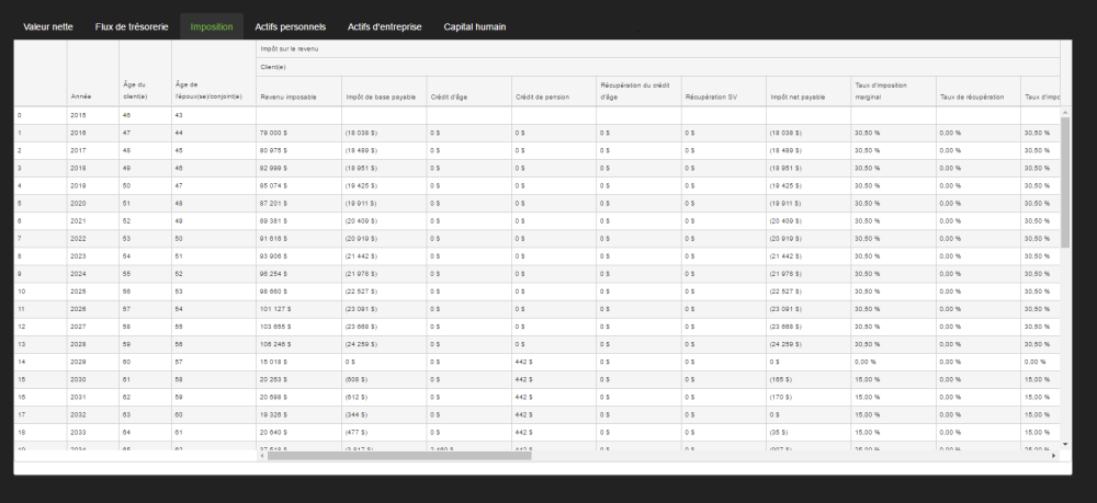 L’onglet de registre d’imposition décrit les calculs de revenu et d’impôt pour chaque année de l’analyse.