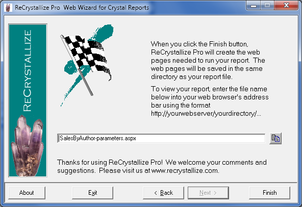 When you click the Finish button, ReCrystallize Pro will produce the web pages for viewing your report. The web page files will be located in the same directory as your report (.rpt file). We recommend placing the files beneath
