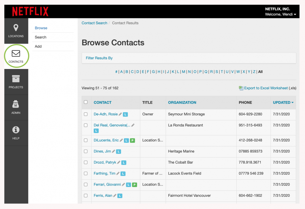 The Contacts module can be accessed by clicking the envelope icon in the menu bar on the left-hand side of your screen. Contacts are stored as individual records and can have an unlimited number of ‘relationships’ with the locations and projects within the Reel-Scout™ RS Studio system. All of the relevant information can be entered, including phone and fax numbers, addresses, and company affiliations.