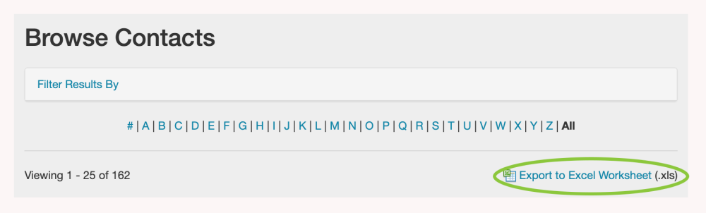 Once you have found the contacts that you want to export, click the Export to Excel Worksheet link on the Browse Contacts page.