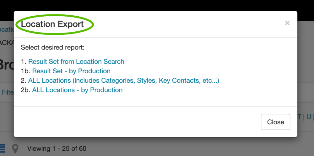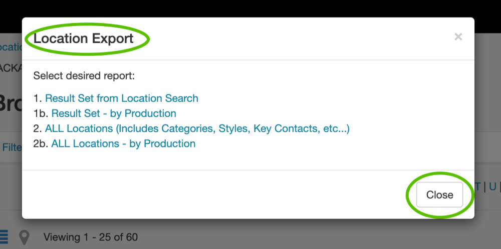 A dialog box will appear that will allow you to: (1) export result set from location search; (1b) export result set by production; (2) export all locations; or (2b) export all locations by production. Click on your desired selection to begin the download.
